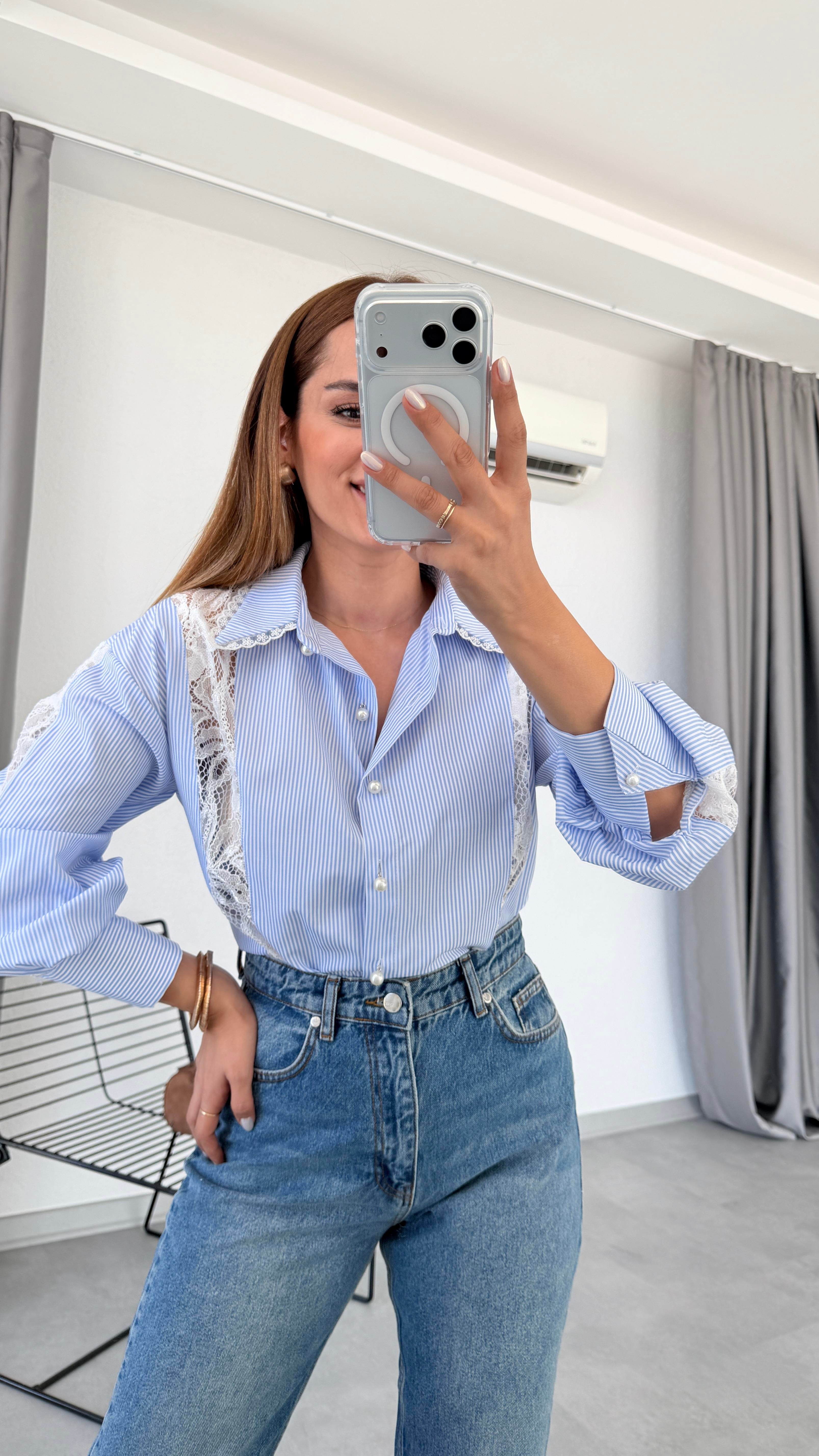 Dantel İşlemeli Mavi Beyaz Çizgili Gömlek